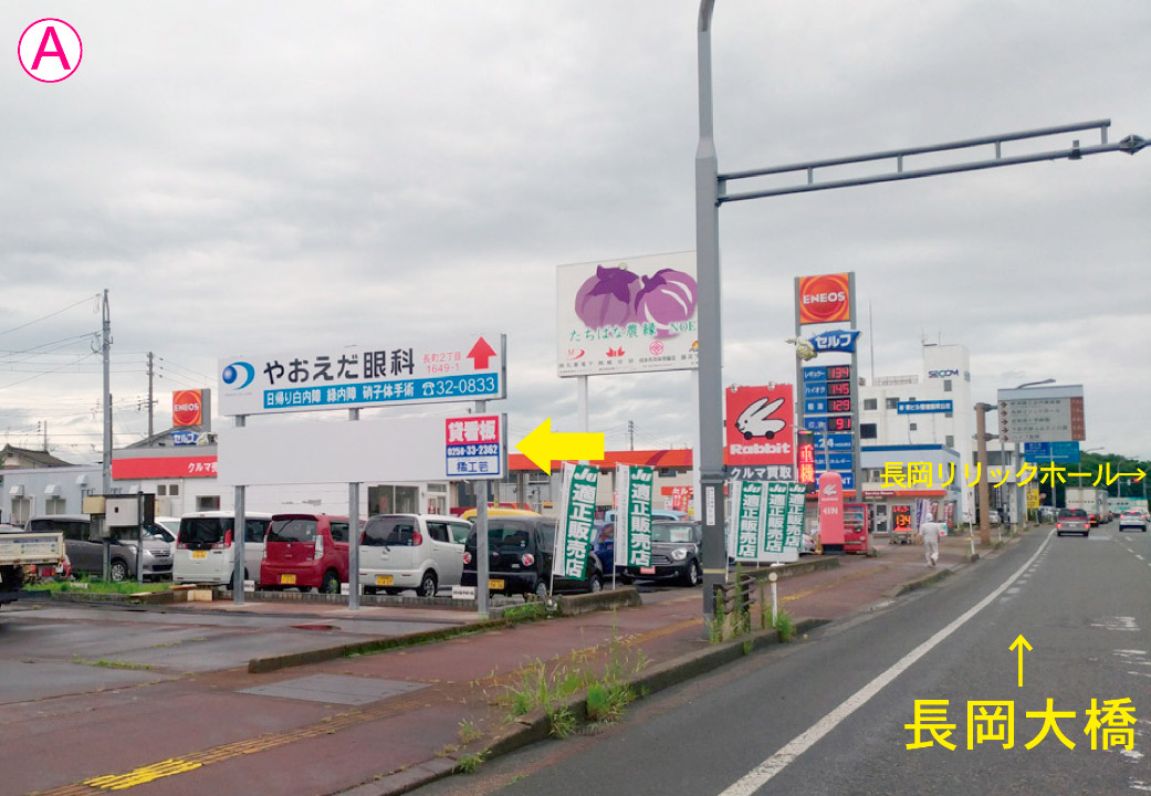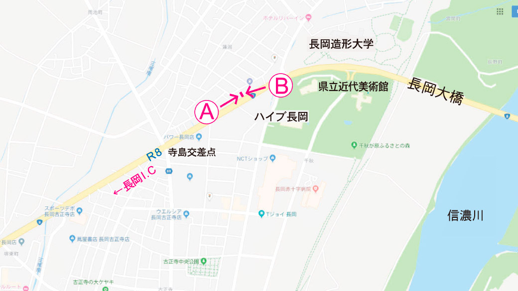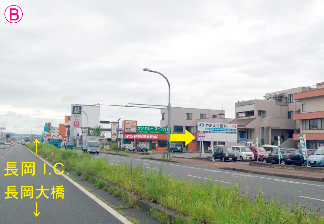 長岡市内で最も交通量が多い国道8号線沿いに位置します。長岡インター方面から長岡大橋方面に向かい左手側です。